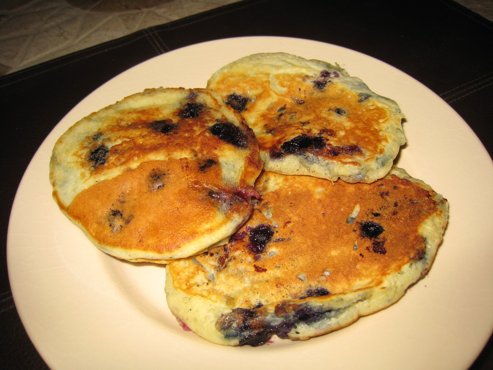 Stir first four ingredients in medium bowl. Make a well in the center. Beat next four ingredients in a small bowl. Add to well. Stir until just moistened. If you are adding the blueberries to the batter, fold them in now. Pour 1/4 cup into non-stick frying pan for each pancake. Cook for about 30 seconds. I you did not add blueberries to batter, arrange blueberries on pancakes in a happy face. Turn pancakes over when edges start to dry and bubbles break on the surface. Cook until golden.