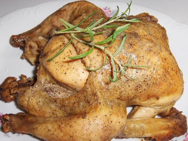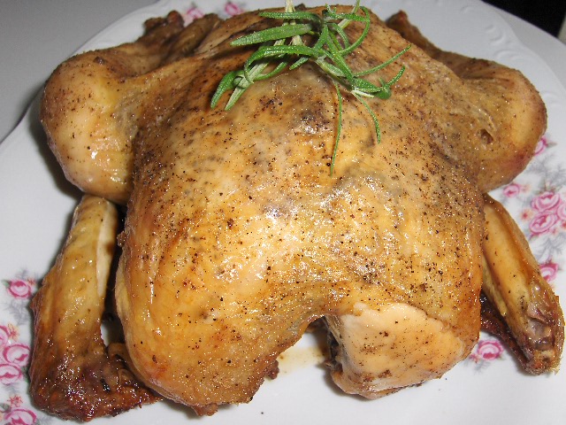 Preheat oven to 450. Wash and completely dry the chicken, inside and out, (this is the key, you do not want the bird to steam). Sprinkle liberally with freshly cracked pepper and Kosher or Sea salt (if all you have is table salt use only a little). Place in a roasting pan sprayed w/ a tiny amount of oil. Roast uncovered in a 450 oven for one hour. Let the chicken rest 15 minutes on a cutting board. Slice chicken and serve with the pan juices.