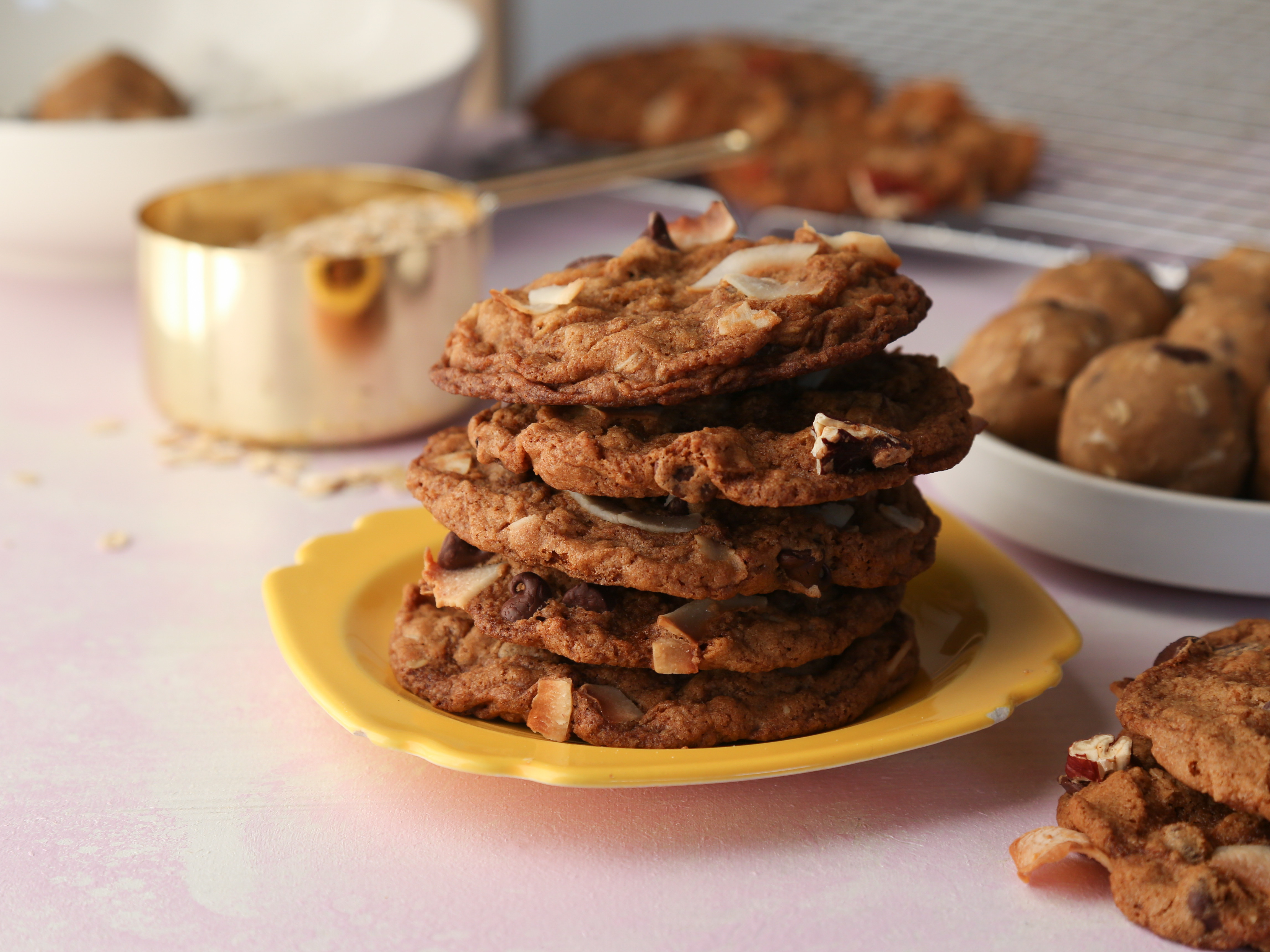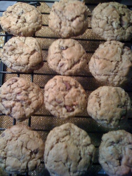 Heat over to 350. Mix flour, baking soda, cinnamon and salt in bowl. Beat butter on medium speed until smooth and creamy, gradually beat in sugars, beat to combine. Add eggs one at a time, add vanilla. Stir in flour mixture until just combined. Add chocolate chips, oats, coconut and pecans. For each cookie drop 1/4 cup dough onto ungreased baking sheet (I use a large ice cream scoop). Bake at 350 for 17-19 minutes or until edges are lightly browned. Cool cookies on rack.