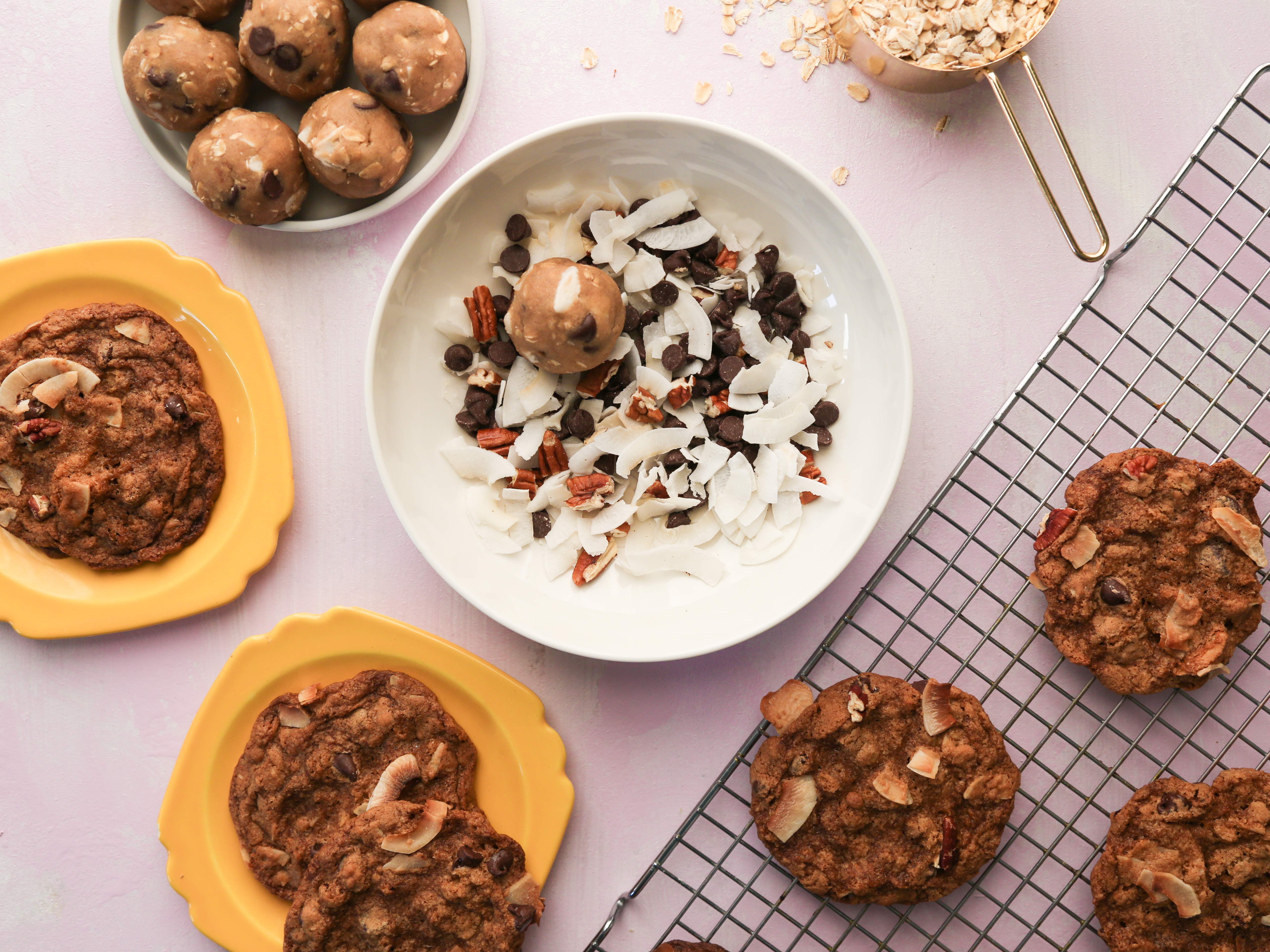 3 cups all-purpose flour 1 tablespoon baking powder 1 tablespoon baking soda 1 tablespoon cinnamon 1 teaspoon salt 1 1?2 cups butter, at room temperature 1 1?2 cups granulated sugar 1 1?2 cups brown sugar, firmly packed 3 large eggs 1 tablespoon vanilla 3 cups chocolate chips (a mixture of milk or semi) 3 cups old fashioned oats 2 cups sweetened flaked coconut 2 cups chopped pecans
