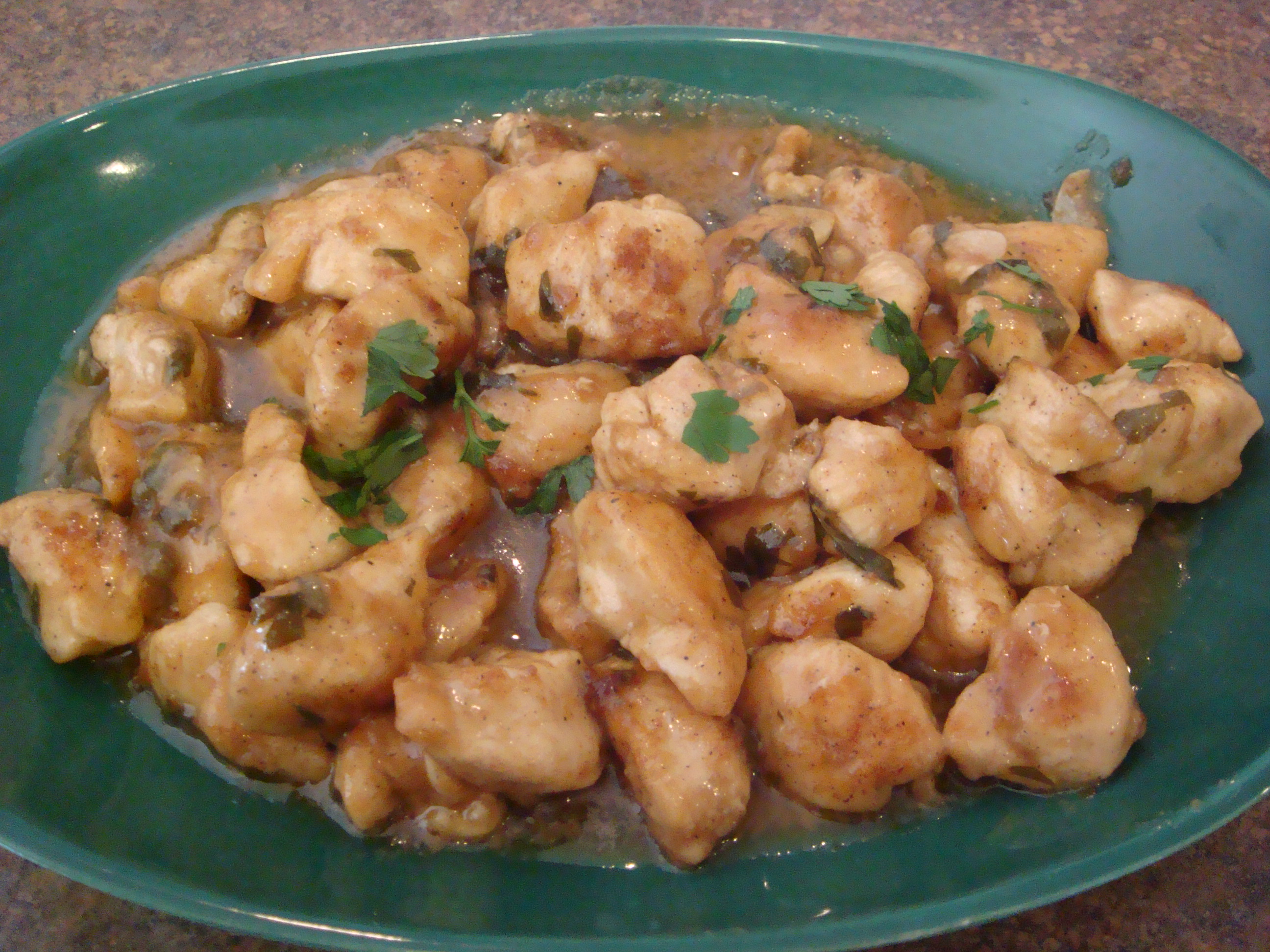 1?2 cup flour 2 tablespoons garlic powder 1 teaspoon salt 1 teaspoon black pepper 1 teaspoon paprika 16 ounces boneless skinless chicken breasts, cut into 1-inch cubes 1 tablespoon butter 1 tablespoon extra virgin olive oil 1?2 cup white wine 1?2 cup fat-free chicken broth 1?4 cup lemon juice 2 tablespoons capers 2 tablespoons fresh parsley, chopped 1 lemon, cut into wedges