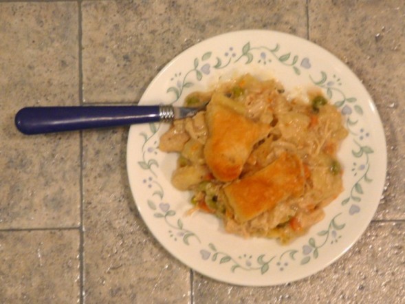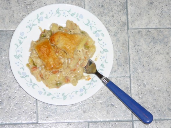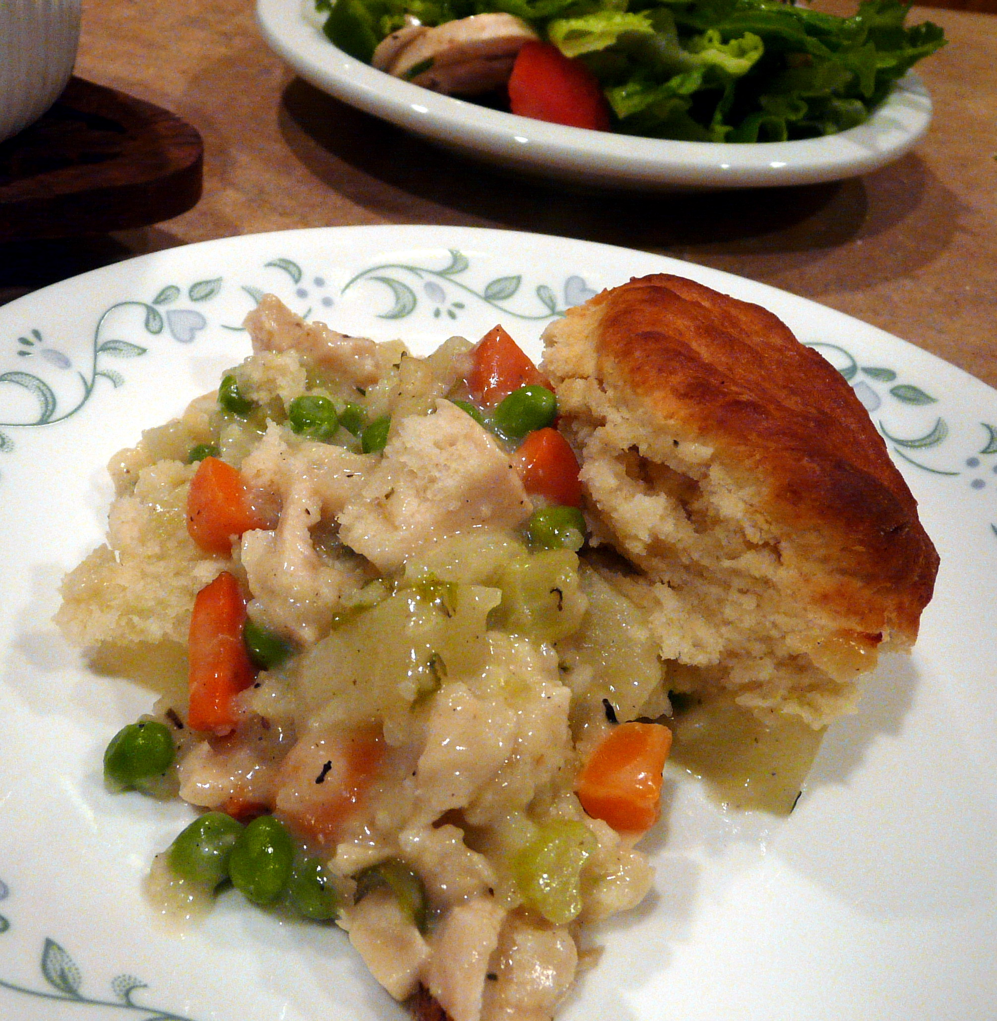 Put chicken breasts in a large pot with water, 3 stalks celery, 1/2 onion, 1 teaspoon poultry seasoning, 1 teaspoon salt, 1/2 teaspoon pepper, and Minor's chicken base. Simmer, covered, until chicken is tender. Remove chicken and let cool. Tear chicken into bite-sized pieces; set aside. Reserve 4 cups of the broth in the pot; discard the cooked vegetables. To the broth, add the carrots, potatoes, 1/2 teaspoon pepper, 1 teaspoon salt, onion powder, and 3/4 teaspoon poultry seasoning. Cook for 10 minutes. Add 1/2 cup chopped onion, peas, and 1/2 cup chopped celery. Cook for an additional 10 minutes or until vegetables are tender; add chicken. In a small bowl, add flour to the evaporated milk; stir into the vegetable mixture. Cook until the mixture thickens (add more flour if necessary). Adjust seasoning, if necessary. Pour the mixture into a greased 9x13" baking dish. Top with biscuit rounds, cutting some in half, if necessary, to cover top of mixture. Bake in a 400 degree oven for 25 minutes, or until biscuits are golden brown and mixture is bubbly. Remove from oven and brush tops of biscuits with butter or margarine. Biscuits:. In a medium bowl, stir together flour, baking powder, and salt. Cut in shortening until mixture resembles coarse meal. Add milk; mix well. Turn dough onto a lightly floured surface. Roll out to 1/2" thickness. Cut with 2-3/4" biscuit cutter. Makes 15 biscuits.