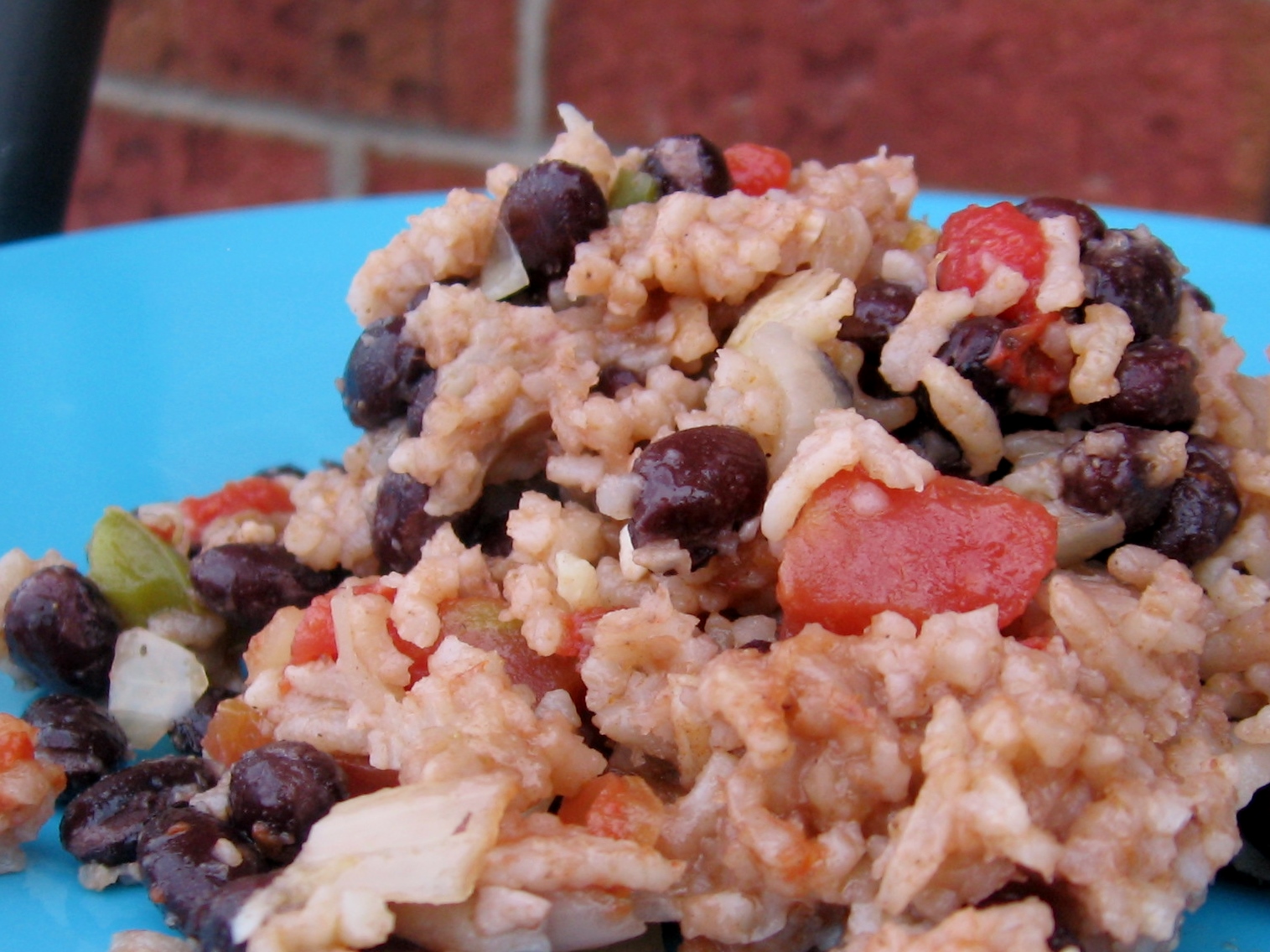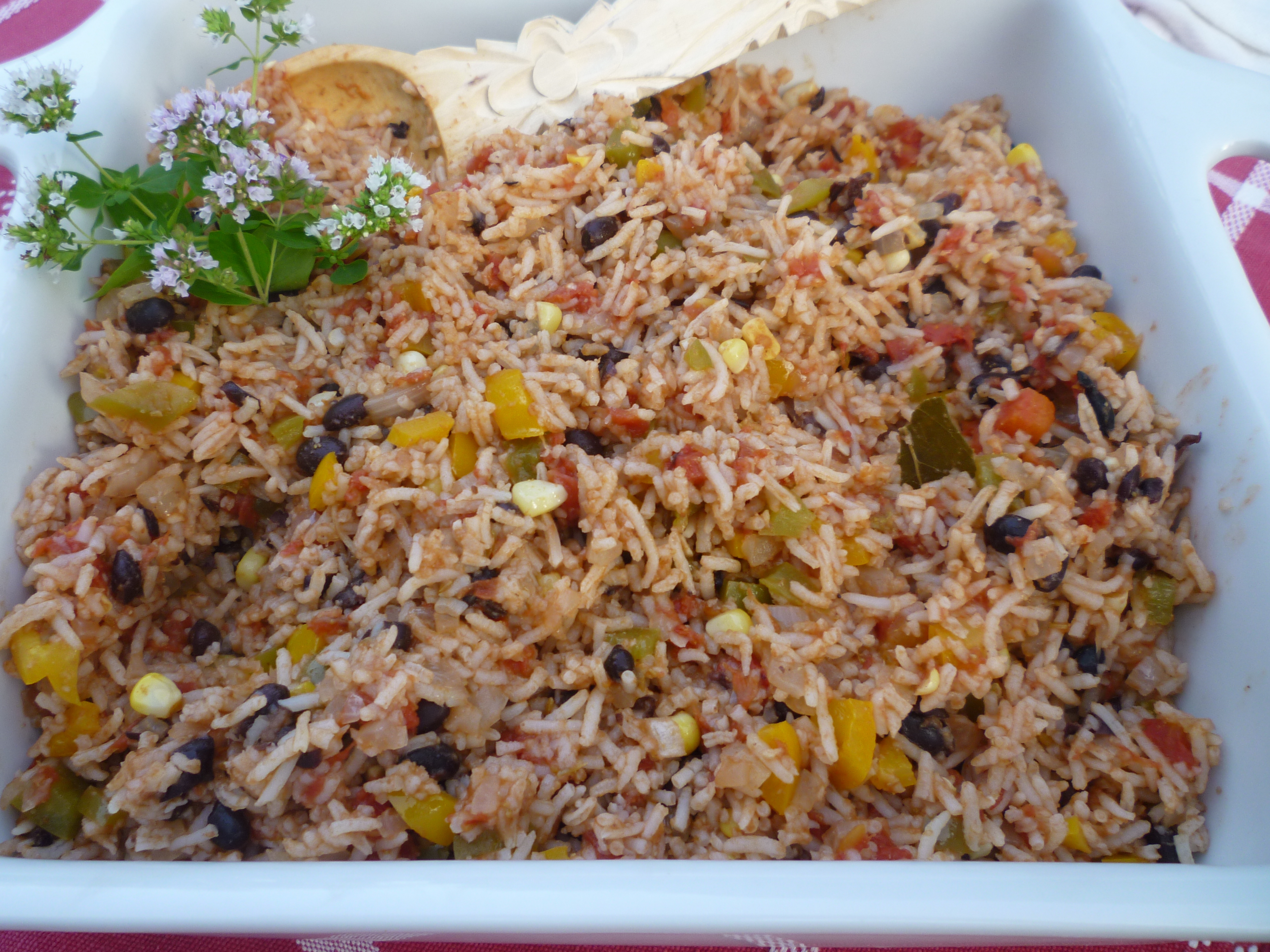 Saute the onions, green bell peppers, garlic, bay leaves, and cumin in the olive oil over medium heat, until the veggies are tender, but still crisp. Add rice, black beans, tomatoes, water, vinegar, salt, and pepper. Mix well and bring to a boil. Once boiling, switch to low and cover. Cook for about 40 minutes, or until rice is ready.