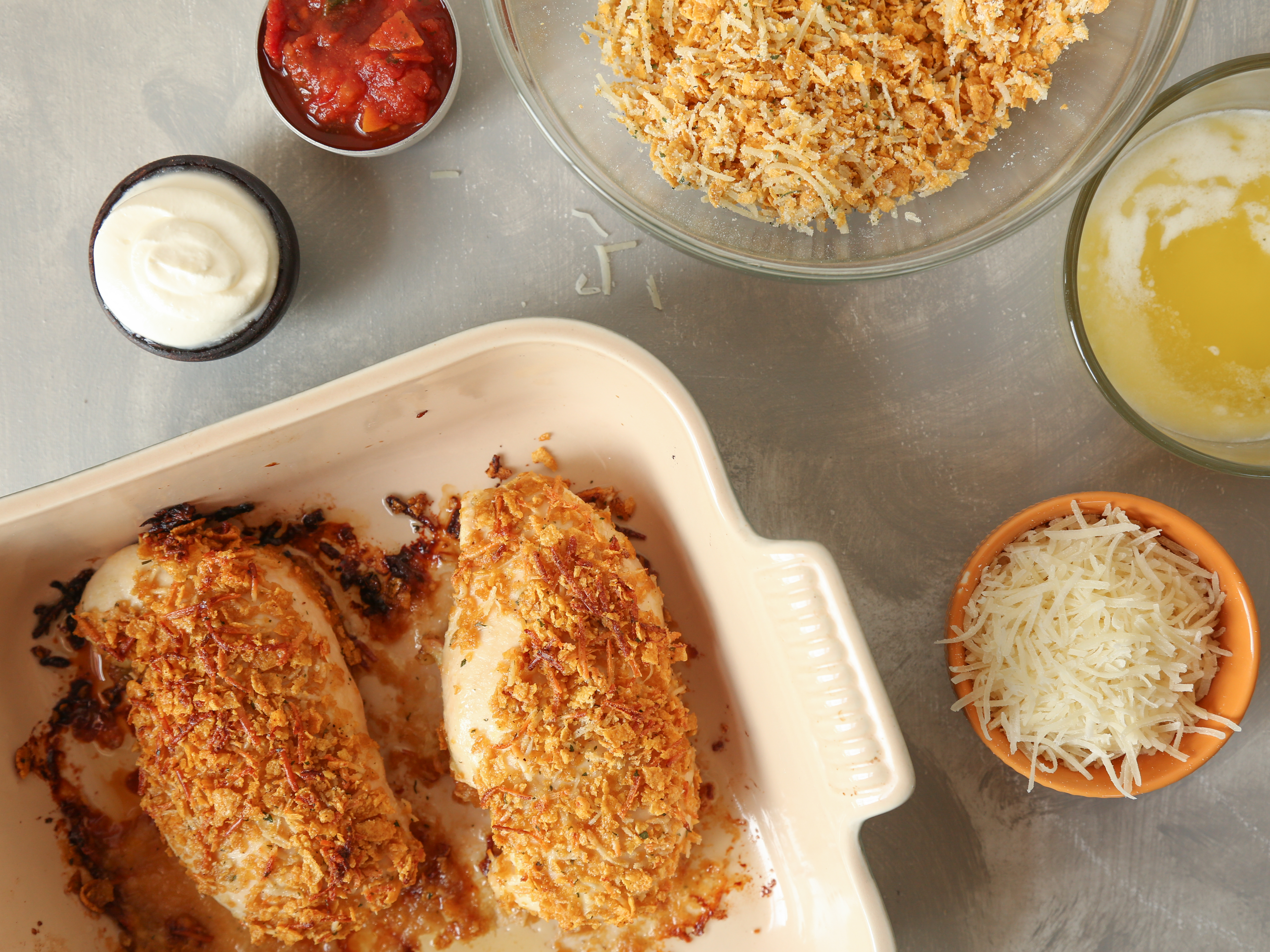2 lbs boneless skinless chicken breasts 3?4 cup parmesan cheese 3?4 cup crushed corn flakes 1 (1 ounce) envelope ranch dressing mix 1?2 cup melted butter or 1/2 cup melted margarine