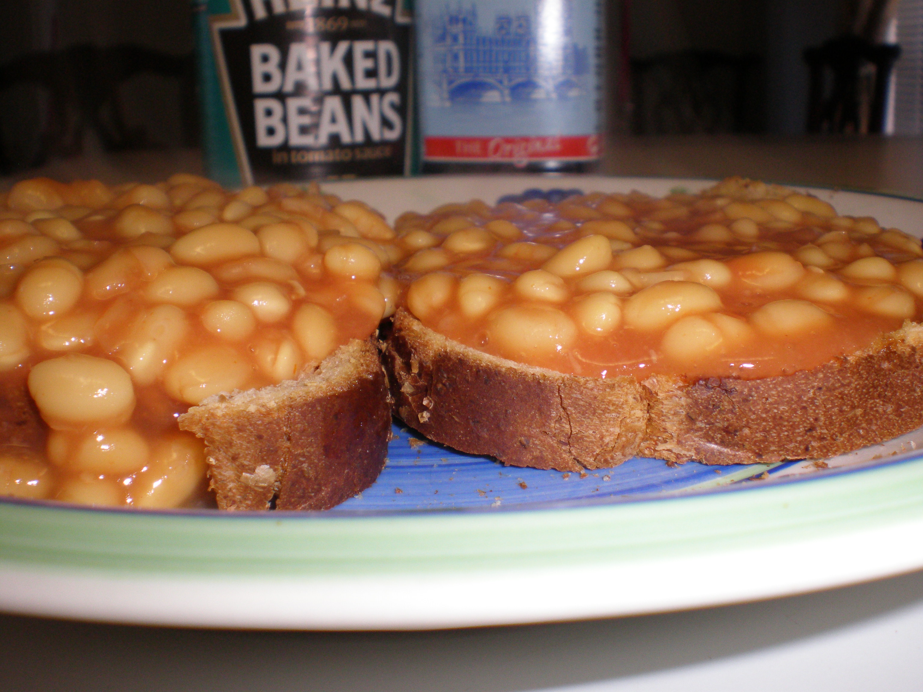 2 slices bread (white is traditional, but I use low-carb rye) 1 (220 g) can of heinz baked beans in tomato sauce (both products come in a blue can, DO NOT USE AMERICAN Pork & Beans or "Bush's Beans" etc. ONLY Heinz) Worcestershire sauce