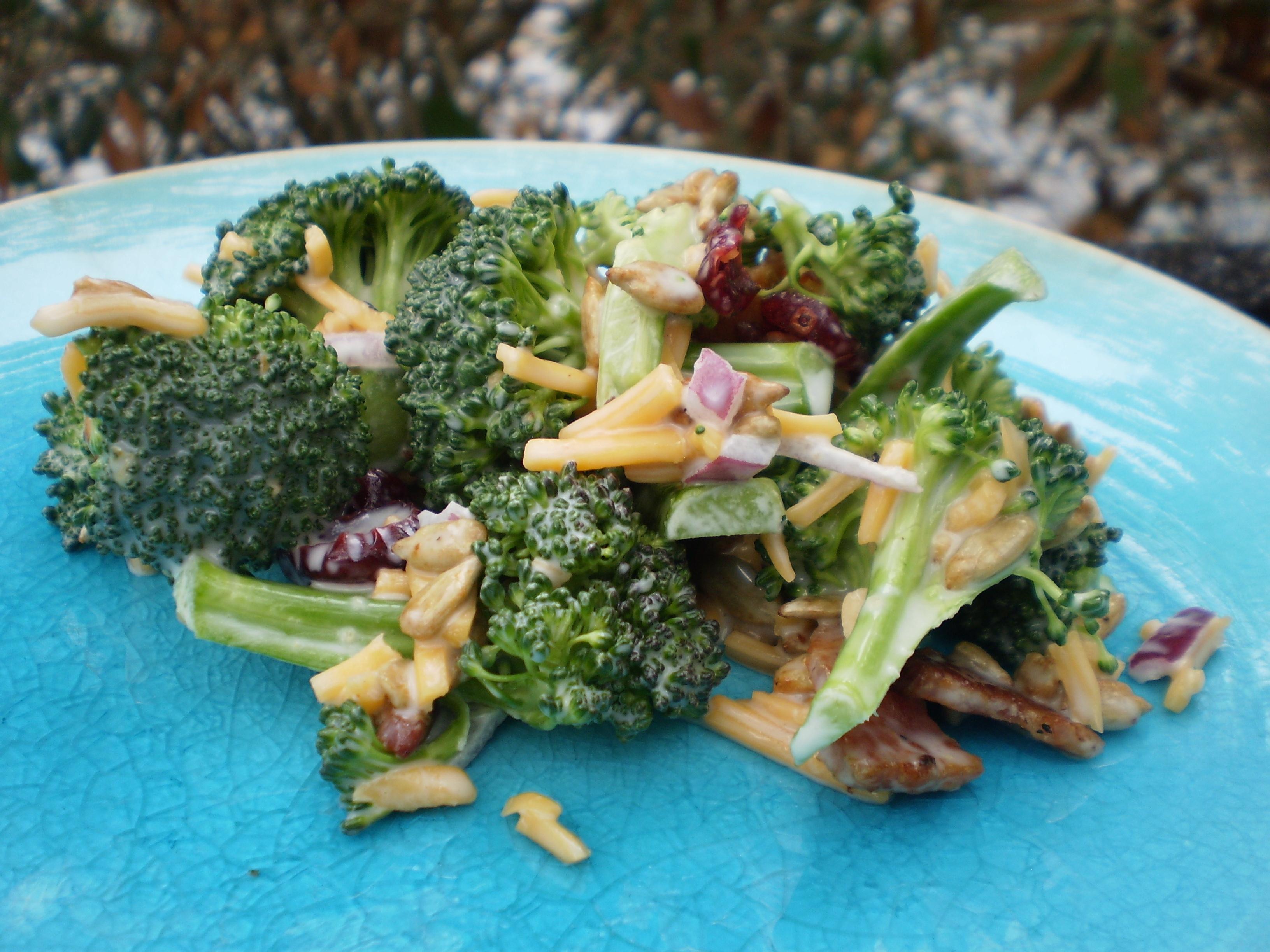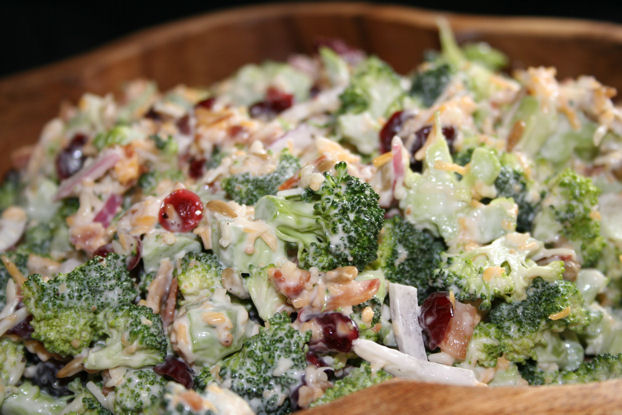 5 cups broccoli florets, cut into 1/2-inch pieces 1?2 cup red onion, chopped 1 cup sharp cheddar cheese, shredded 1 cup cooked bacon, crumbled 1 cup sunflower seeds 3?4 cup dried sweetened cranberries DRESSING 1 cup salad dressing or 1 cup mayonnaise 1?4 cup sugar 2 tablespoons red wine vinegar 1?2 teaspoon salt 1?4 teaspoon pepper