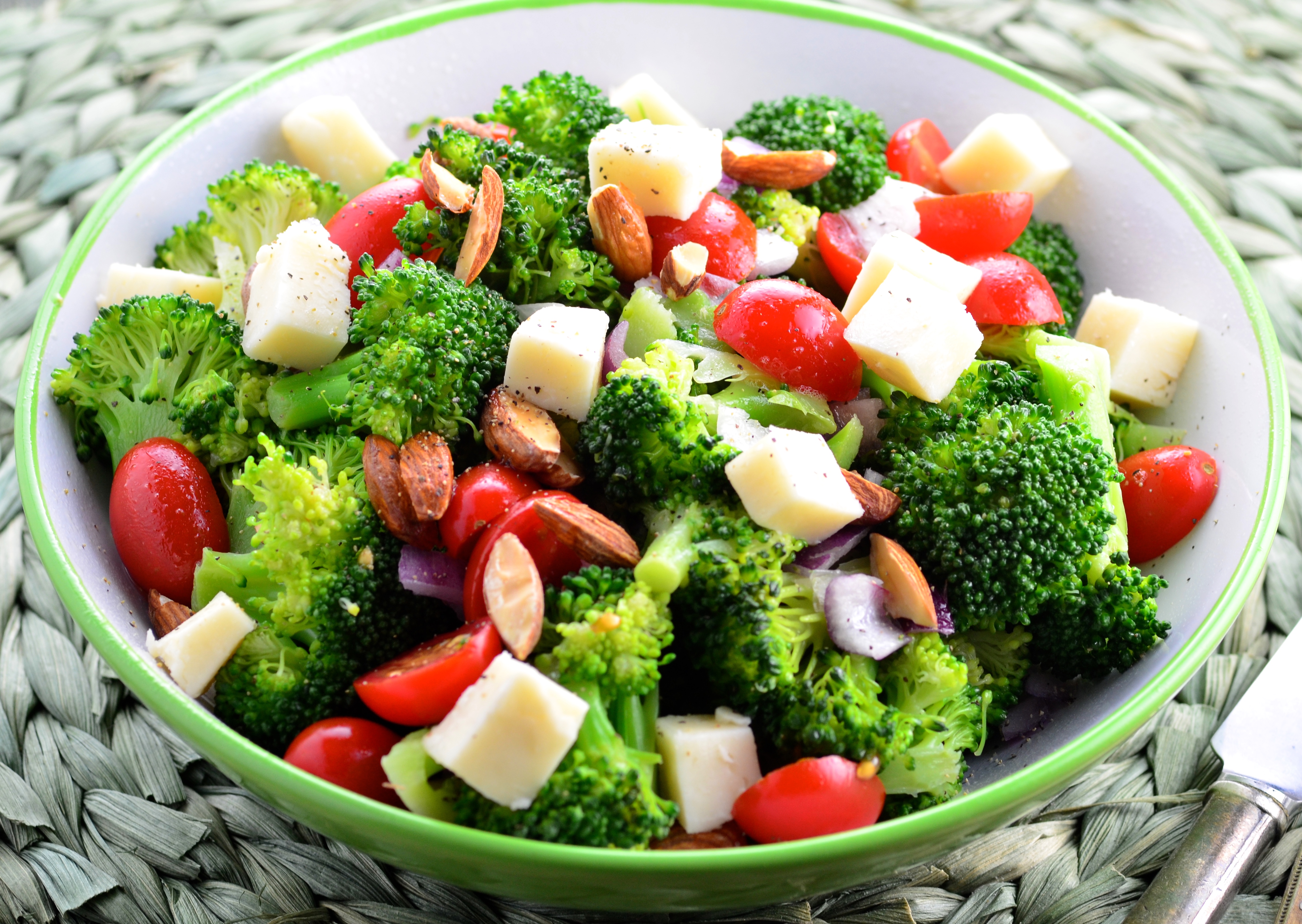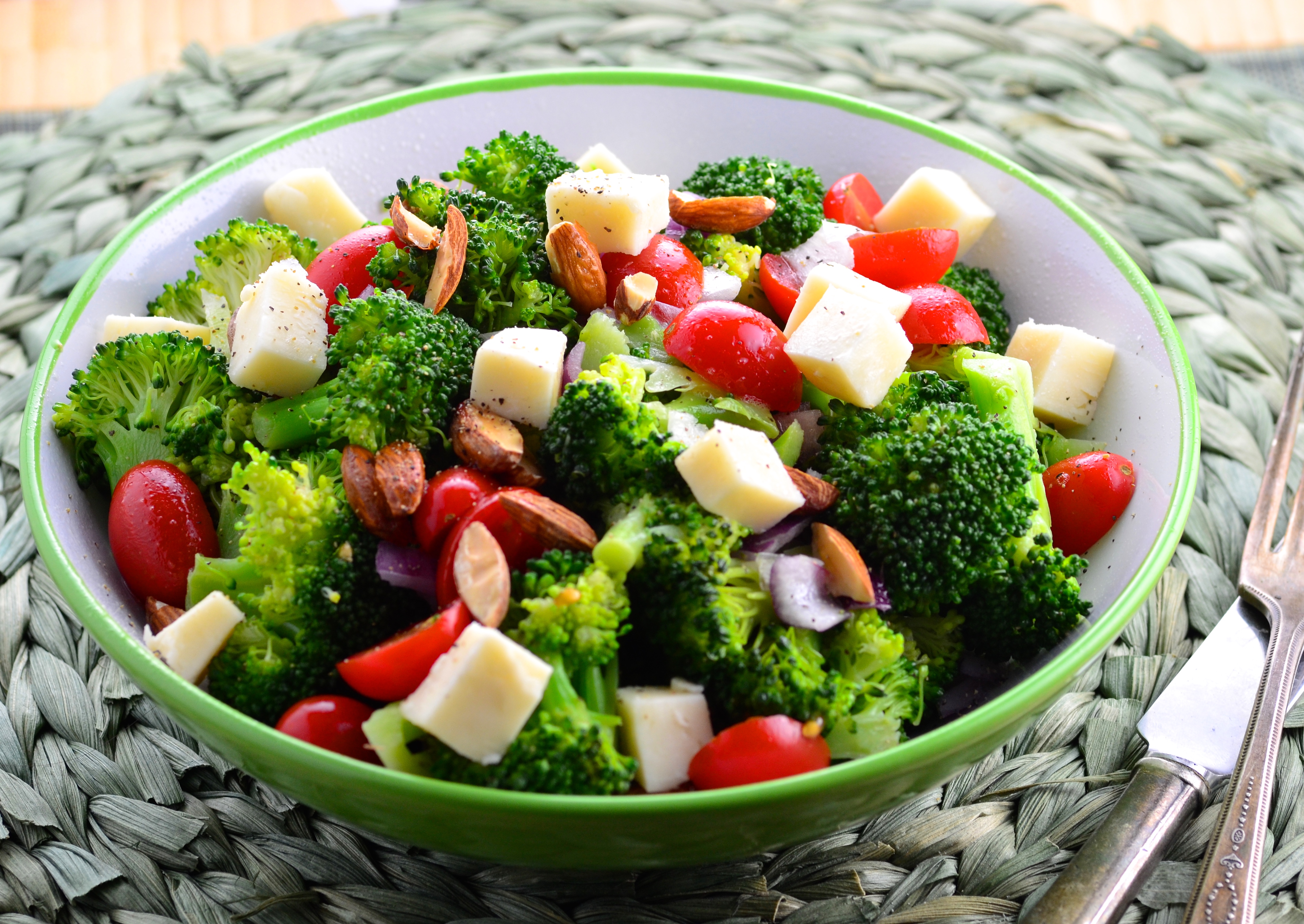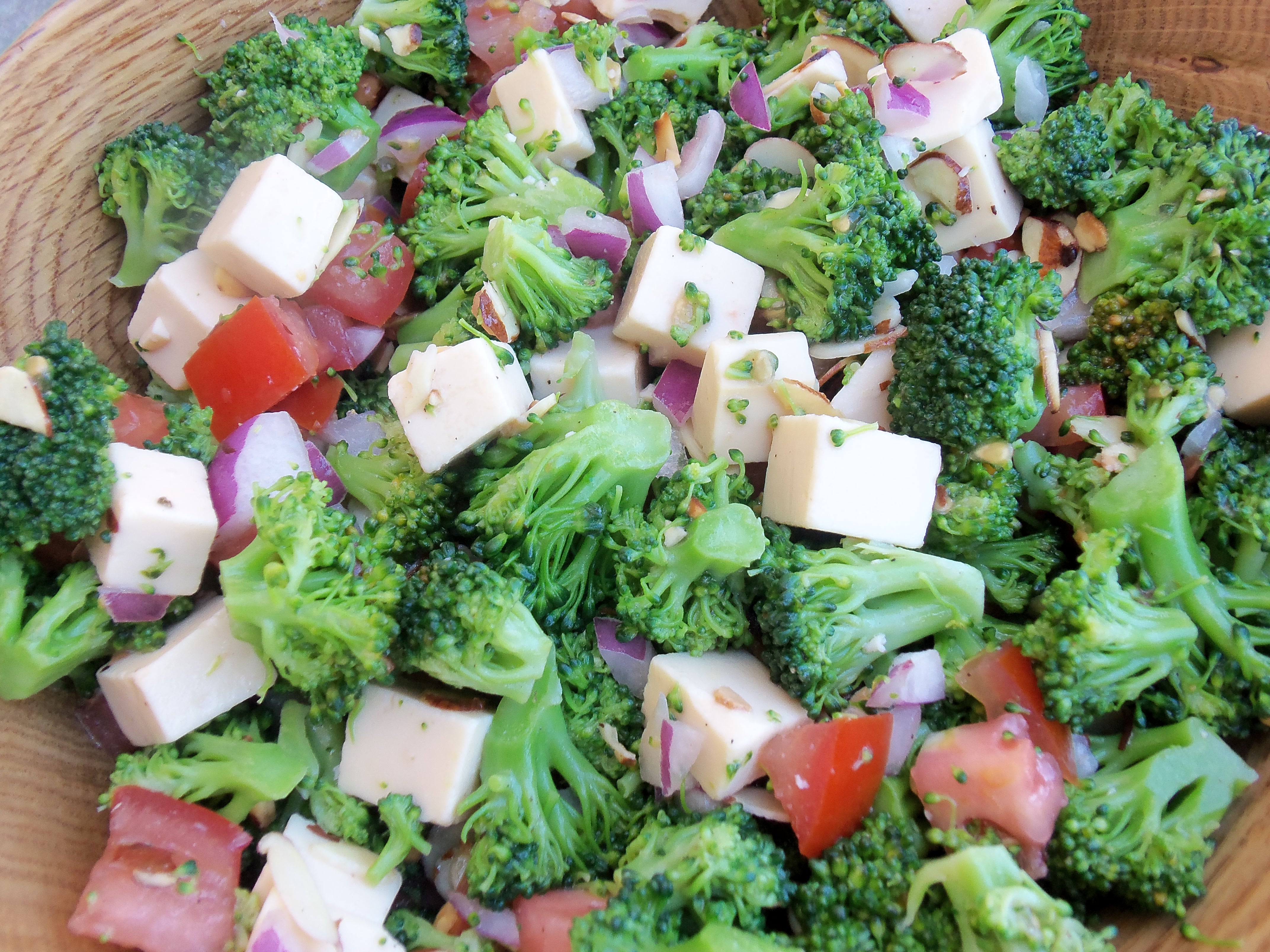 3 cups small broccoli florets 1?4 cup chopped red onion 1?2 cup grape tomatoes, halved 1?2 cup toasted slivered almonds (or pine nuts) 6 -8 ounces gouda cheese, cut into 3/4-inch cubes (smoked or regular) 1?8 cup extra virgin olive oil 1?3 cup red wine vinegar 1?4 teaspoon sugar 1?4 teaspoon black pepper salt, to taste