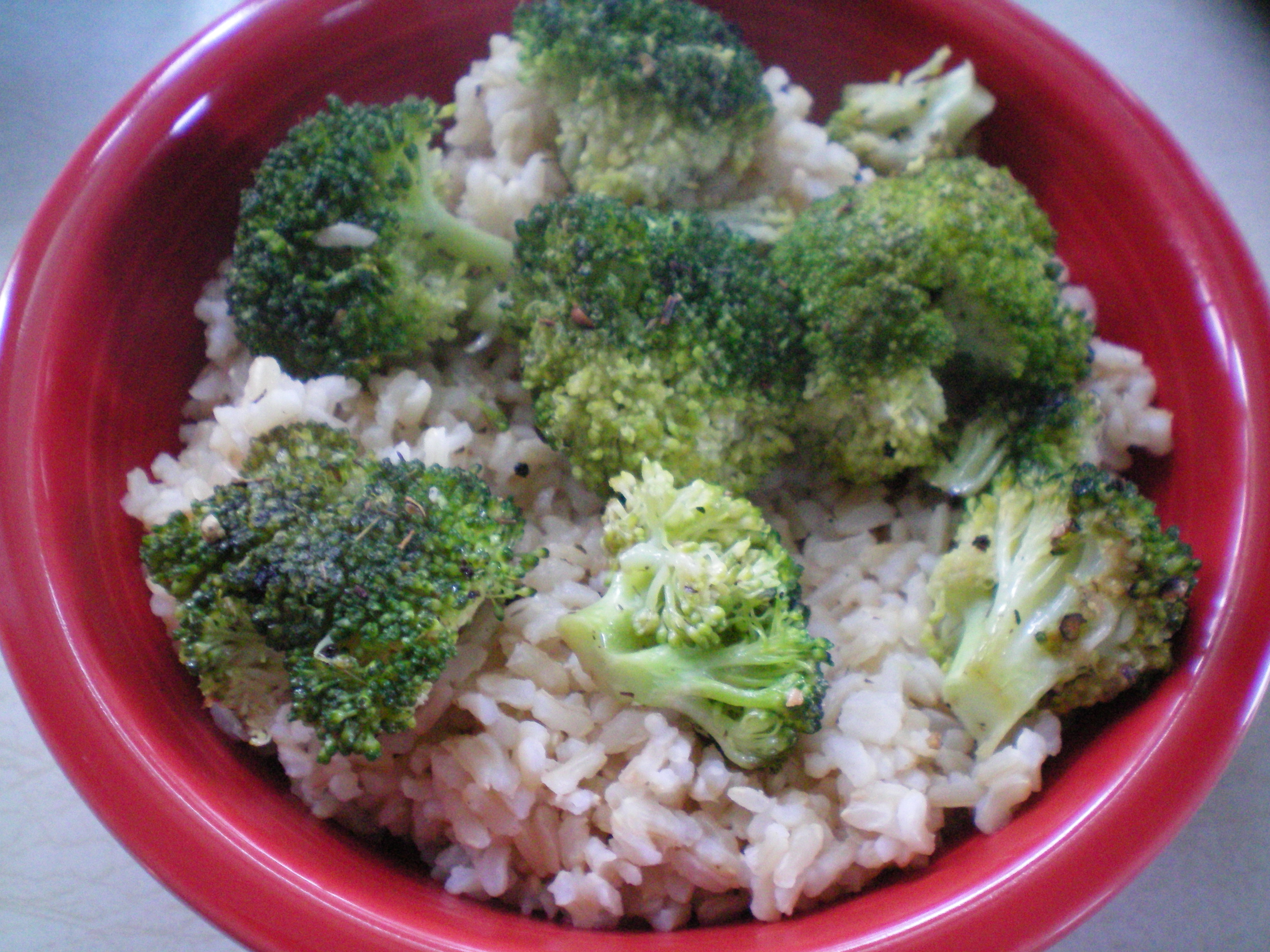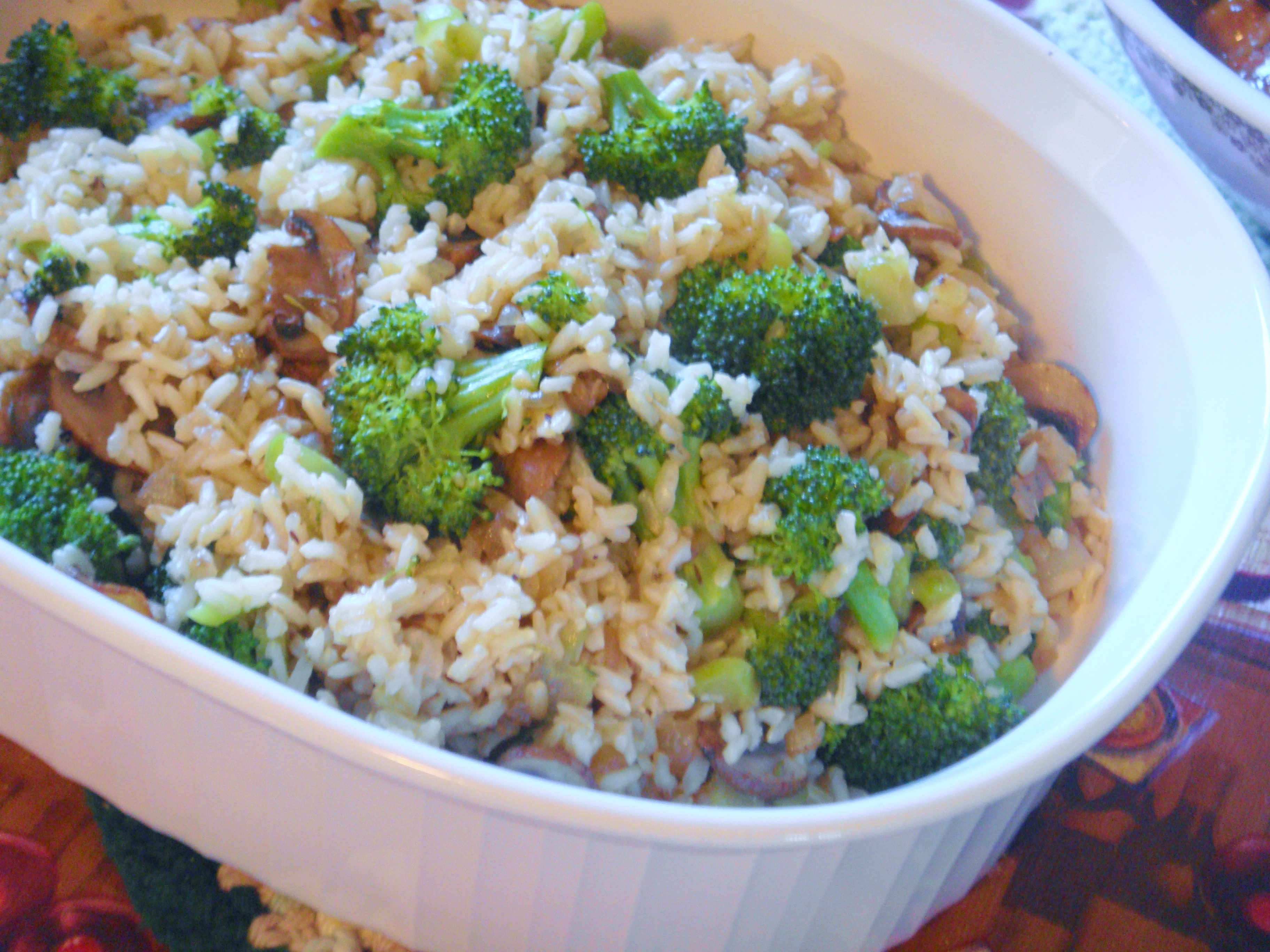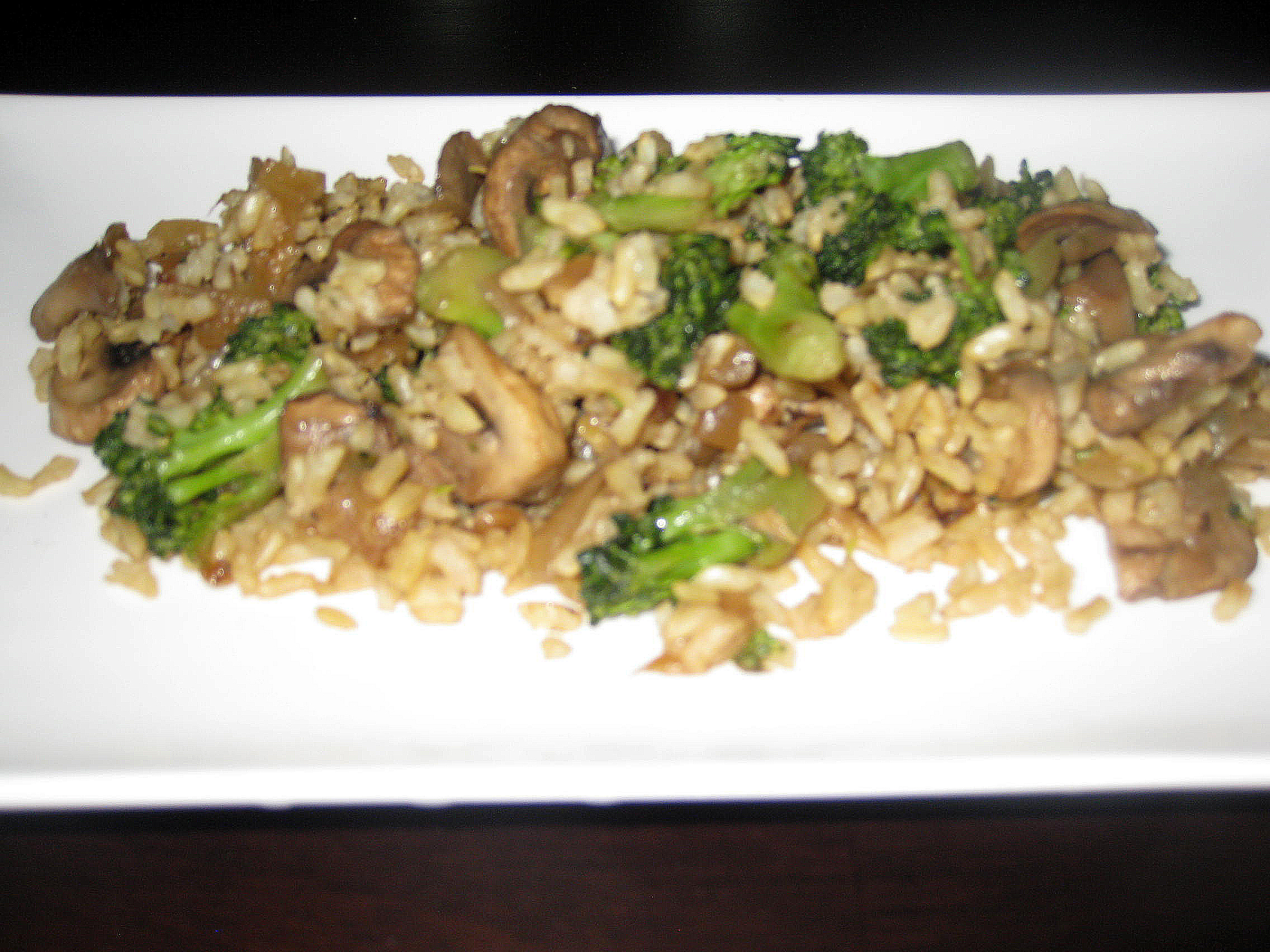 Prepare rice as directed on box using broth of your choice. Meanwhile over medium-high heat, heat olive oil and add onion. Saute for 3 minutes, stirring often. Add broccoli and cover for 3 minutes, stirring occasionally. Add mushrooms and remaining ingredients to pan and saute until mushrooms release their juices, approximately 5 minutes. Serve over brown rice.