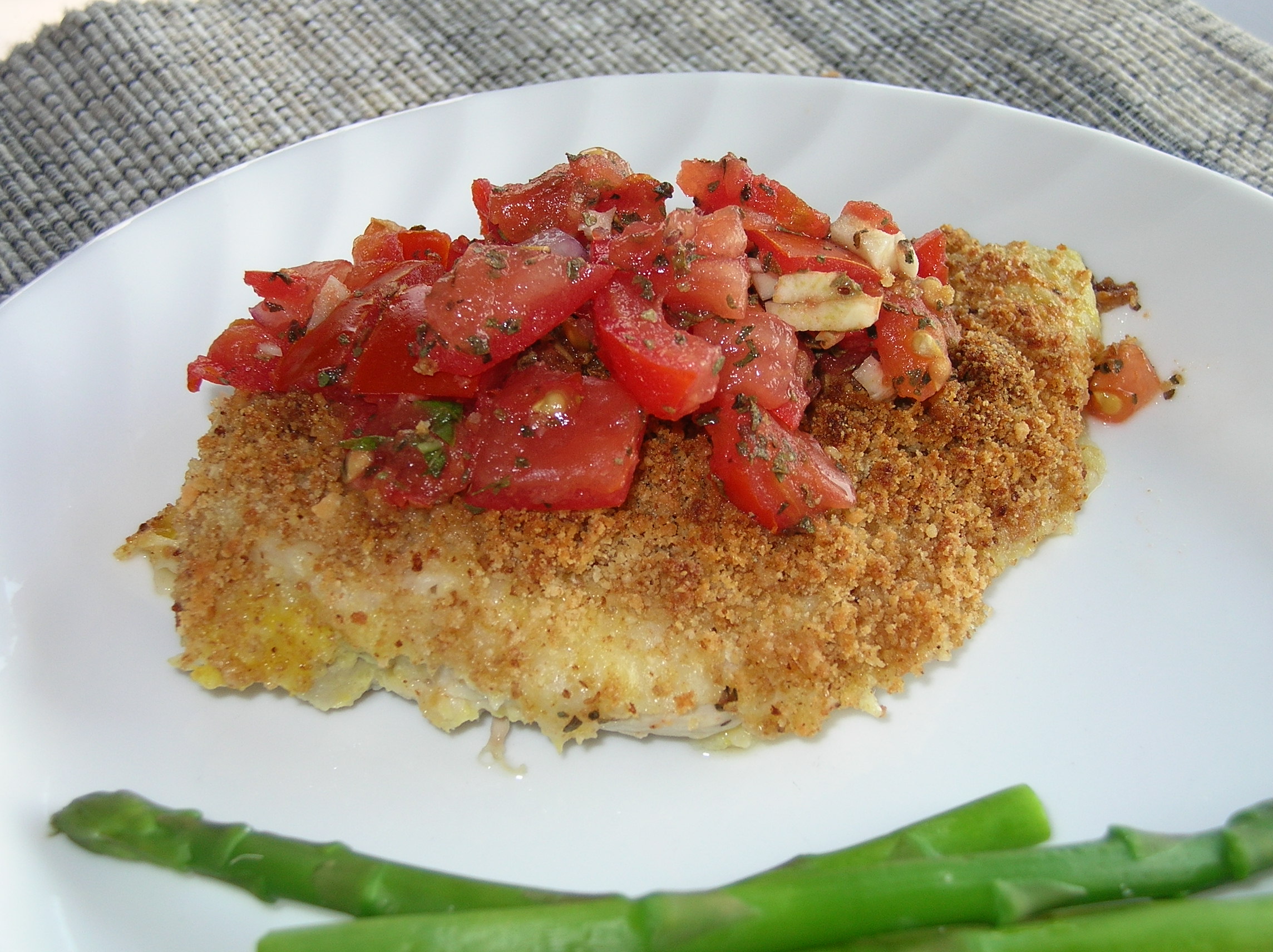 1?2 cup flour 2 eggs, slightly beaten 4 boneless skinless chicken breasts 1?4 cup grated parmesan cheese 1?4 cup dry breadcrumbs 1 tablespoon butter or 1 tablespoon margarine, melted 2 large tomatoes, chopped & seeded 1 tablespoon olive oil 2 garlic cloves, minced 3 tablespoons minced fresh basil, set aside a few whole leaves as garnish (coriander or cilantro can also be used for a different taste) 1?2 teaspoon salt 1?4 teaspoon pepper