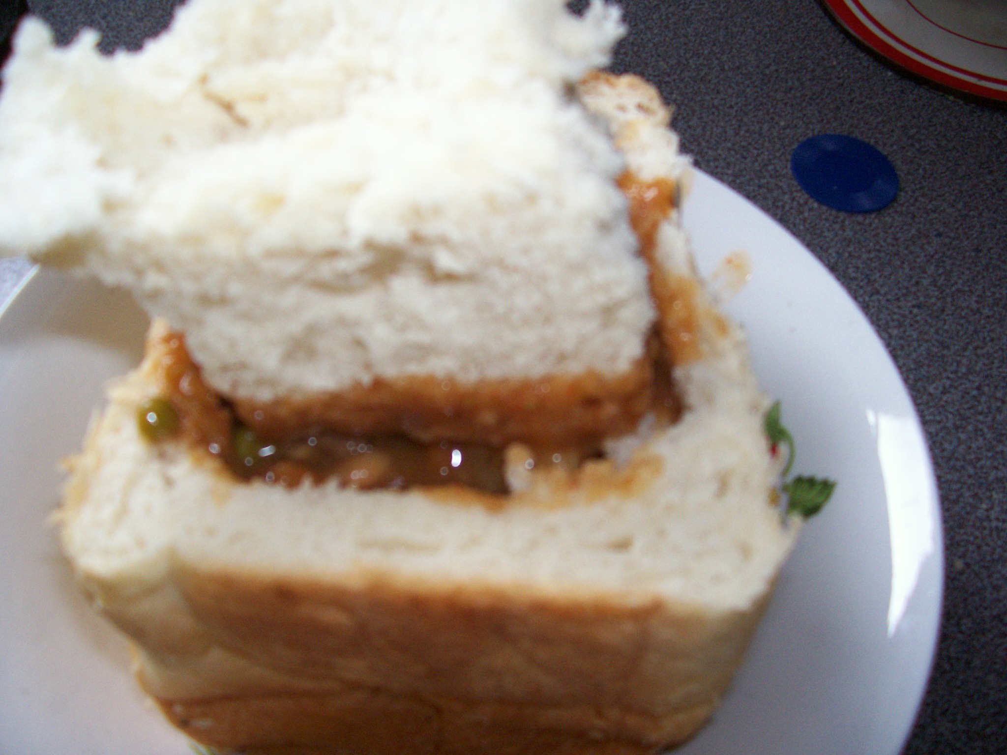 Fry all the ingredients listed under "Whole Spices" until the onion is glassy. Add the list called "Fine Spices". Lingela says: "Stir and fry until the spices stick to the bottom of the pot. If you have a good Teflon-coated pot, go and buy a cheap one first.". Now add the tomatoes, and stir until everything sticking to the pot bottom comes loose. Add the meat, ginger, garlic and curry leaves. Simmer for half an hour or more, until the meat is almost tender, then add a little water and the potato cubes. Simmer until meat is tender. The bread:. It should be the unsliced rectagular loaf with the flat top, known in South Africa as a "Government sandwich loaf". You could cut the bread across into two, three or four even chunks, depending on how hungry the eaters will be. Whatever you decide, with a sharp knife cut out most of the soft white bread, leaving a thick wall and bottom. Keep the bread you removed. Ladle the curry into the hollows, and then put back on top the bread you removed. You could use this bread to help eat the curry, as "this is ALWAYS eaten with the hands". (Actually, any kind of curry goes into a bunny chow. It depends on the cook and your tastes!).