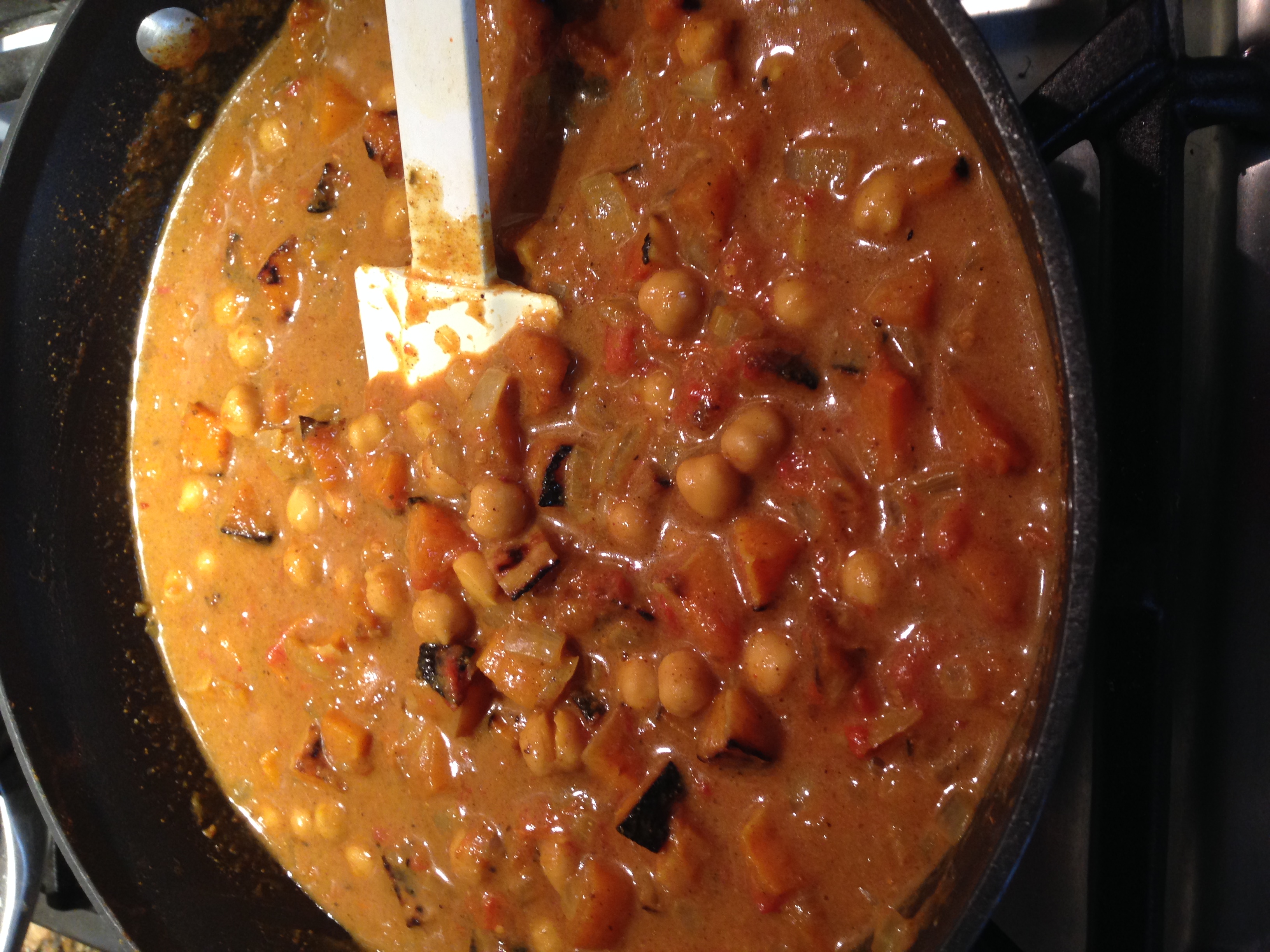 Place cubed butternut squash on a foil lined baking sheet, sprayed with nonstick cooking spray. Sprinkle generously with curry powder, salt and pepper, and roast at 350 for 35-45 minutes, or until tender. You still want them to hold their shape when added to the curry, and not be mush :>. While squash cooks, heat 1-2 tsp of canola oil over medium heat. Add onions and a little bit of salt, and saut 2-3 minutes, or until they begin to soften. Next, add the curry powder, cumin, corriander and cinnamon, and stir to coat the onions evenly with spices. Add tomatoes with their juices, and the chickpeas, stir to combine. Next, add the spinach, stirring to coat with cooking liquid. When all the spinach is added to the pan, cover and simmer until just wilted, about 3 minutes. Add coconut milk and gently stir to combine. Finally, add the roasted butternut squash to the liquid, and stir to coat. Top with fresh chopped cilantro (optional) and serve over basmati rice (I like brown basmati).
