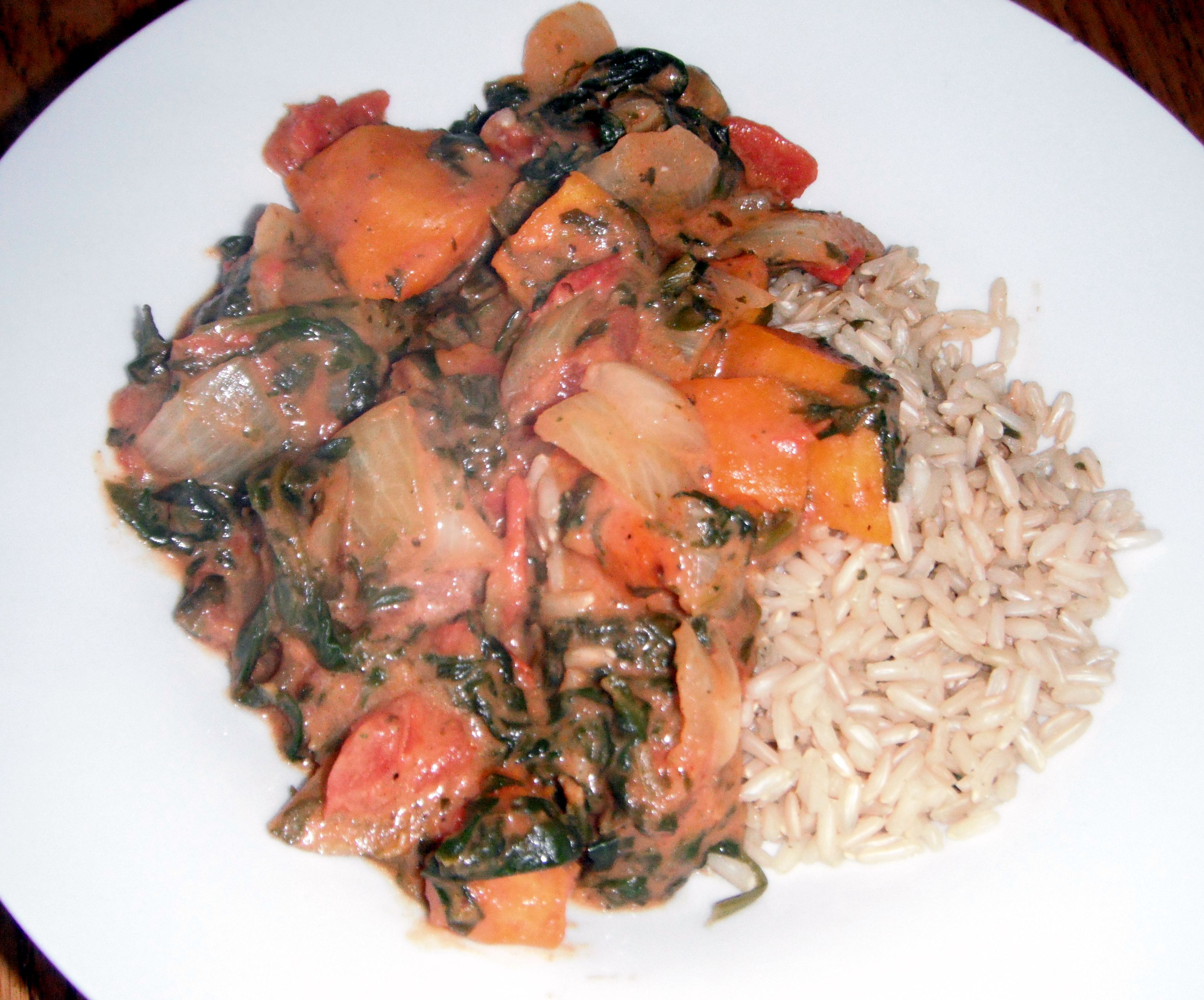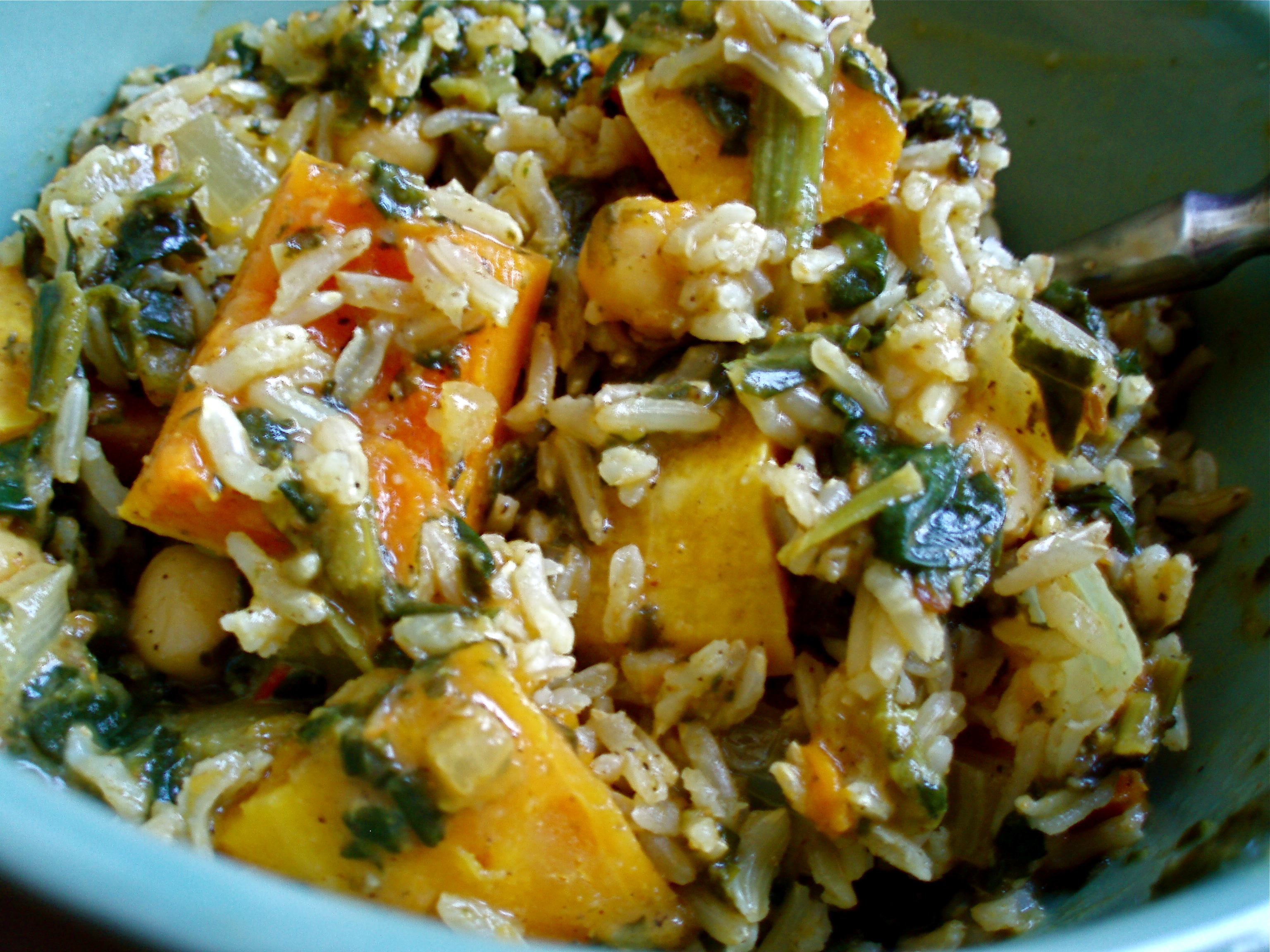 1 onion, chopped 1 -2 teaspoon canola oil 2 tablespoons curry powder 1 tablespoon cumin 1 tablespoon coriander 1 teaspoon cinnamon 10 ounces frozen spinach, thawed and drained 2 small butternut squash, peeled, seeded, cubed curry powder, salt and pepper for sprinkling over squash 1 (14 1/2 ounce) can chickpeas, rinsed and drained 1 (14 1/2 ounce) can diced tomatoes 1 (14 1/2 ounce) can light coconut milk salt and pepper, to taste 1?4 cup cilantro, chopped for garnish basmati rice or brown rice, for serving